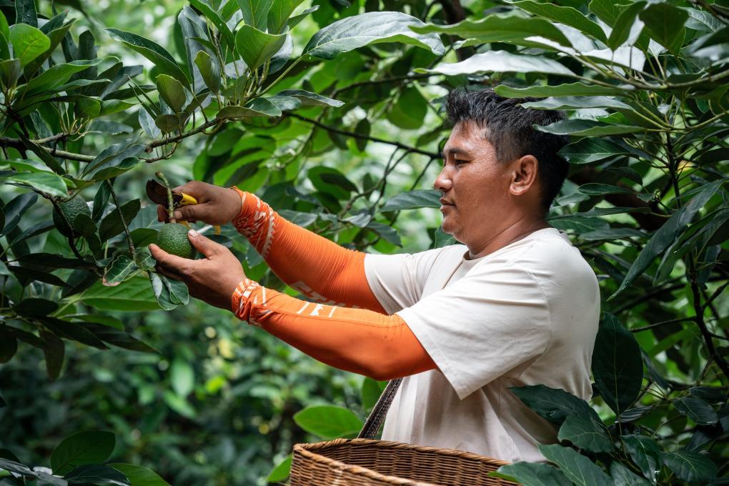 在芒信鎮的群山中,發展著一株株牛油果樹,綠油油的果子高揚枝頭,沈衛國正警惕翼翼地將果子摘下,放進背簍中。