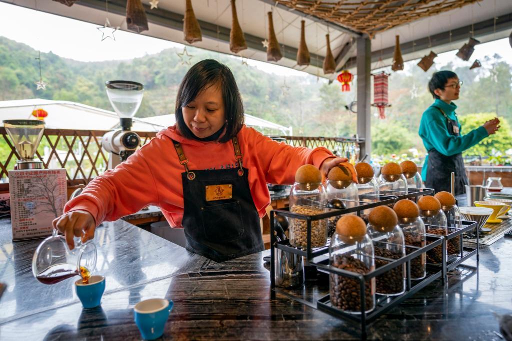 咖啡義工在小凹子咖啡莊園為游客倒咖啡。新華社記者 陳欣波 攝