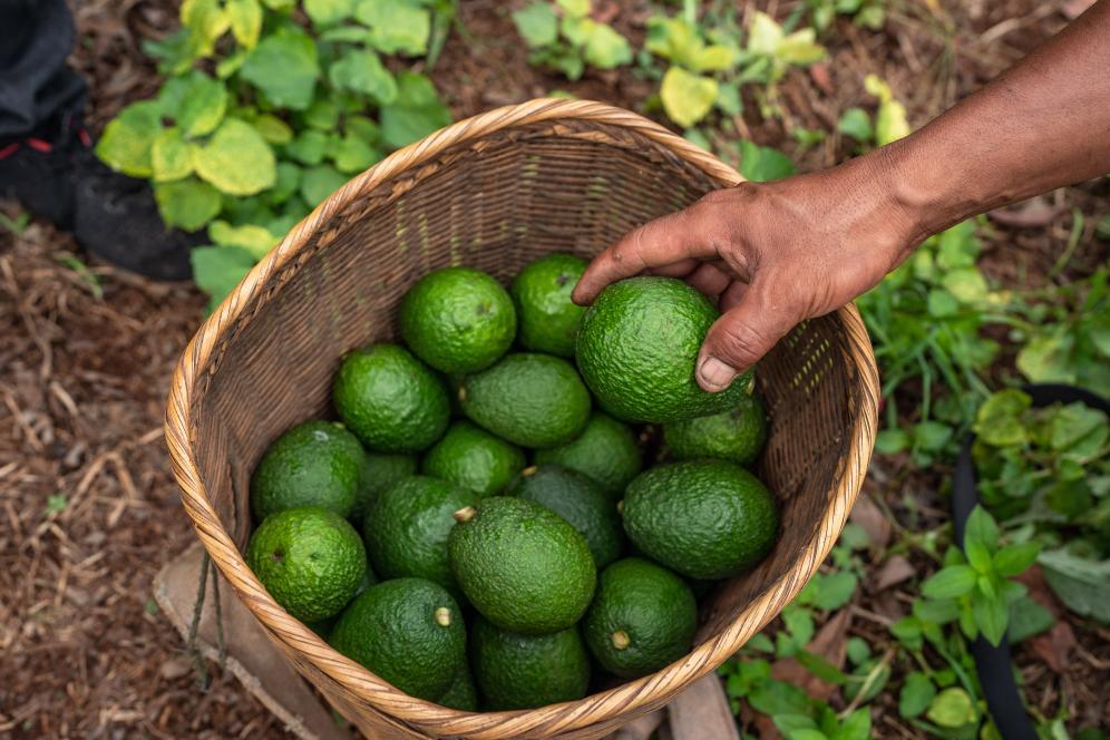 在孟連縣娜允鎮南雅村牛油果蒔植基地,農戶把采摘的牛油果放進竹簍。新華社記者 胡超 攝