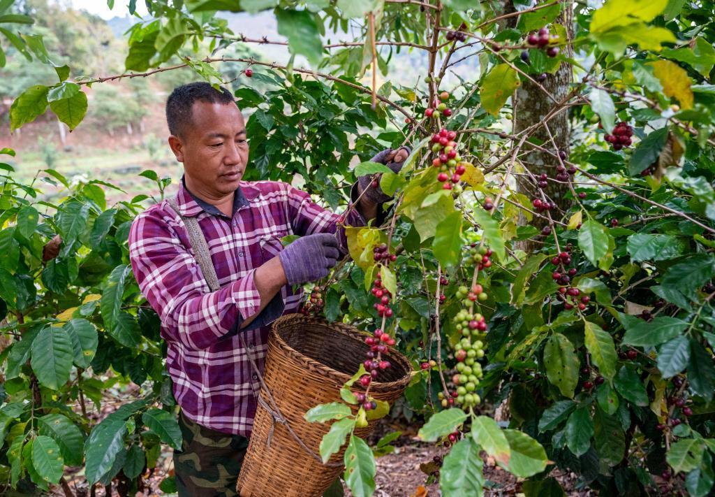 普洱市思茅區南屏鎮年夜開河村村平易近在采摘咖啡果。新華社記者 陳欣波 攝